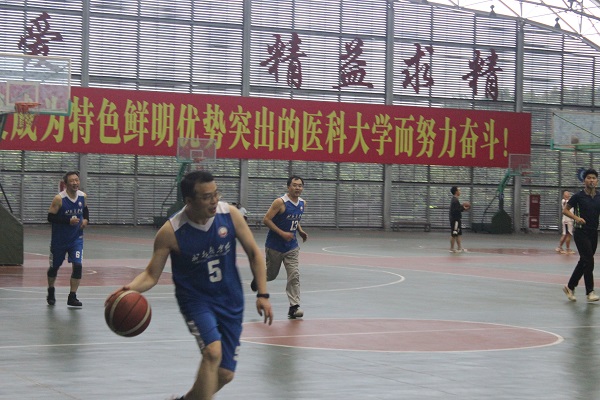 篮球赛上,本院教职工与外援共同组队,分别与机关篮球队、检验篮球队、附院篮球队、药学篮球队、四院联队进行比赛,参赛选手奋力拼搏,展示高超的球艺,享受着运动的乐趣。