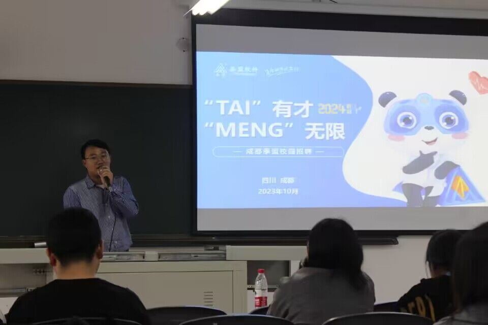 随后成都泰盟软件人力资源部校园招聘负责人对公司及相关政策进行详细介绍,围绕我们是谁、能给员工带来什么、我们需要怎样的你、现场答疑、介绍招聘流程五个环节展开讲述。向同学们介绍了公司的种类、生产何种产品、公司福利体系、薪酬结构、以及招聘标准。宣讲完毕后,来到现场的同学们积极和校园招聘负责人进行沟通交流,校园招聘负责人对有意向的同学的简历进行收取,同时现场解答大家的各种疑问。
