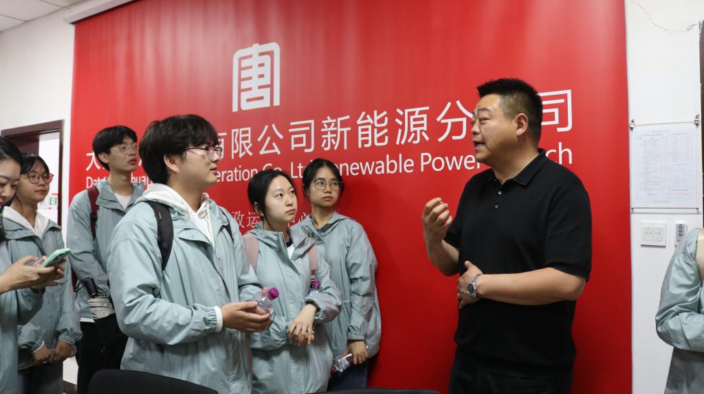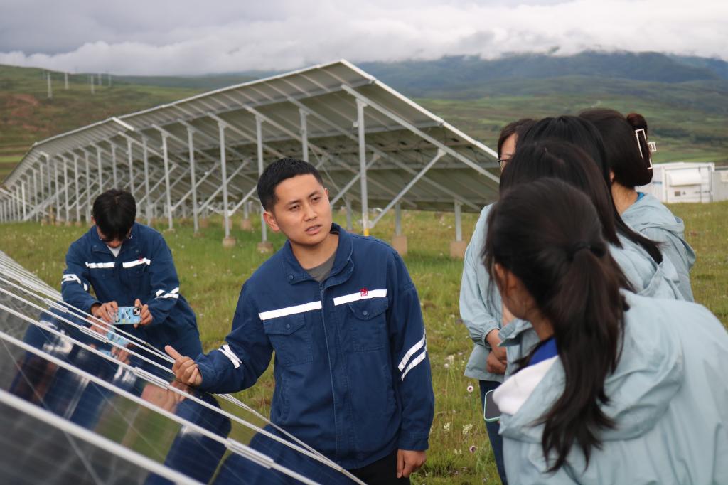 在甘孜县火古龙光伏电站,数以万计的光伏发电板铺满山坡,宛如一片熠熠生辉的黑色海洋,令实践团成员们惊叹不已。在电站负责人陈东的引领下,成员们参观了光伏电站的核心区域。他详细介绍了电站的建设历程、技术特点及运营情况:“火古龙电站位于甘孜镇的火古龙村,占地1560亩,总投资达4.52亿元。采用先进的光伏发电技术,实现了高效、稳定、清洁的电能输出。电站的建成不仅为当地群众带来了稳定的经济收益,提升了生活水平,还在减少温室气体排放、保护高原生态环境方面发挥了重要作用。”实践团成员首次近距离接触光伏发电板,好奇地轻触板面,感受着高质量发展的时代脉搏。