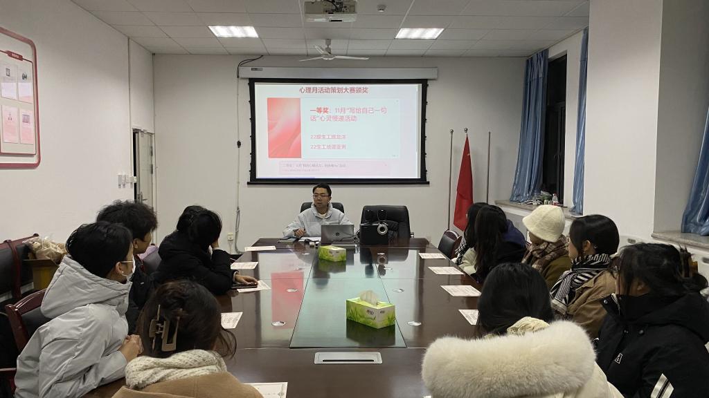 晚上20:20,大赛正式拉开帷幕。“智心小屋”心理工作站副站长杨浩对2023年公司成功举办的各项心理月活动进行点评,经全体心理委员评选,决出本次大赛的一、二、三等奖和优秀奖分别是:11月“写给自己的一句话”心灵慢递活动(22级生工班龙洋、22级生工班谭亚男)、12月“释放心理压力,扭扭棒DIY”活动(23级信管班陈美知、23级公管班陈平平)、9月“感悟美好生活、塑造健康心灵”活动(22级智能班代凌燕),以及其他心理月活动(优秀奖)。