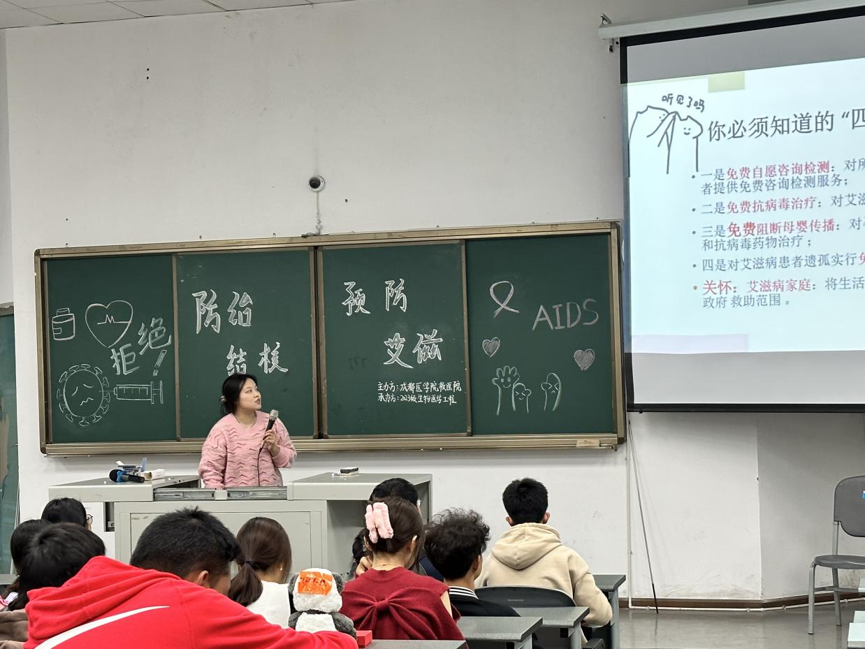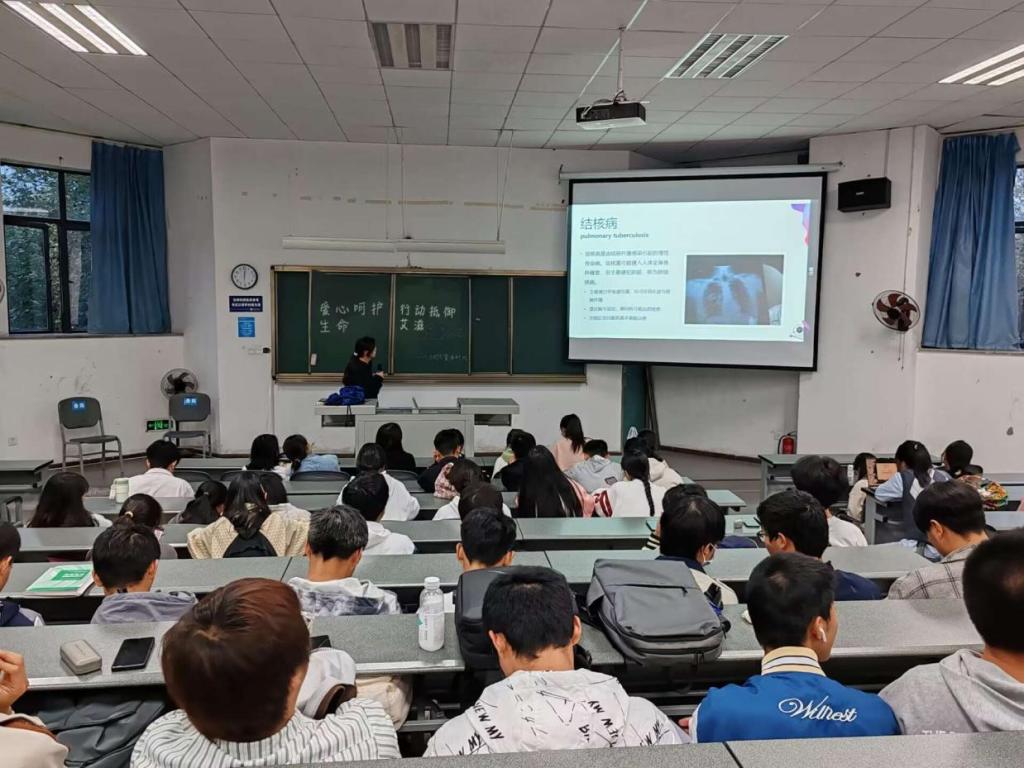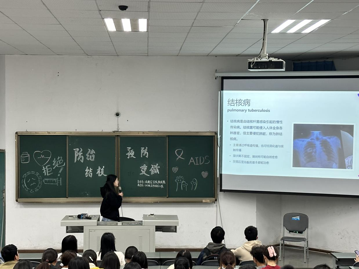 活动期间,各班健康联络员向班级同学分发预防艾滋病健康教育处方传单,并让同学们做了2023年中艾协高校防艾基金项目效果评估问卷调查,在准备工作后,健康联络员同学首先讲解了成都市城乡居民老员工医疗保险政策,包括老生与新生的医疗参保时间范围、新老生参保失败存在的原因以及相关的应对政策、老员工医保的参保待遇、老员工医保不予报销范围;接着又从艾滋病的传播途径、艾滋病的预防措施、艾滋病患者感染症状、“四免一关怀”政策讲解艾滋病的预防相关知识;最后,健康联络员同学讲解了肺结核预防相关知识,包括肺结核传播方式(呼吸道、消化道、接触性母婴传播)、肺结病存在的可疑症状、肺结核的预防措施。