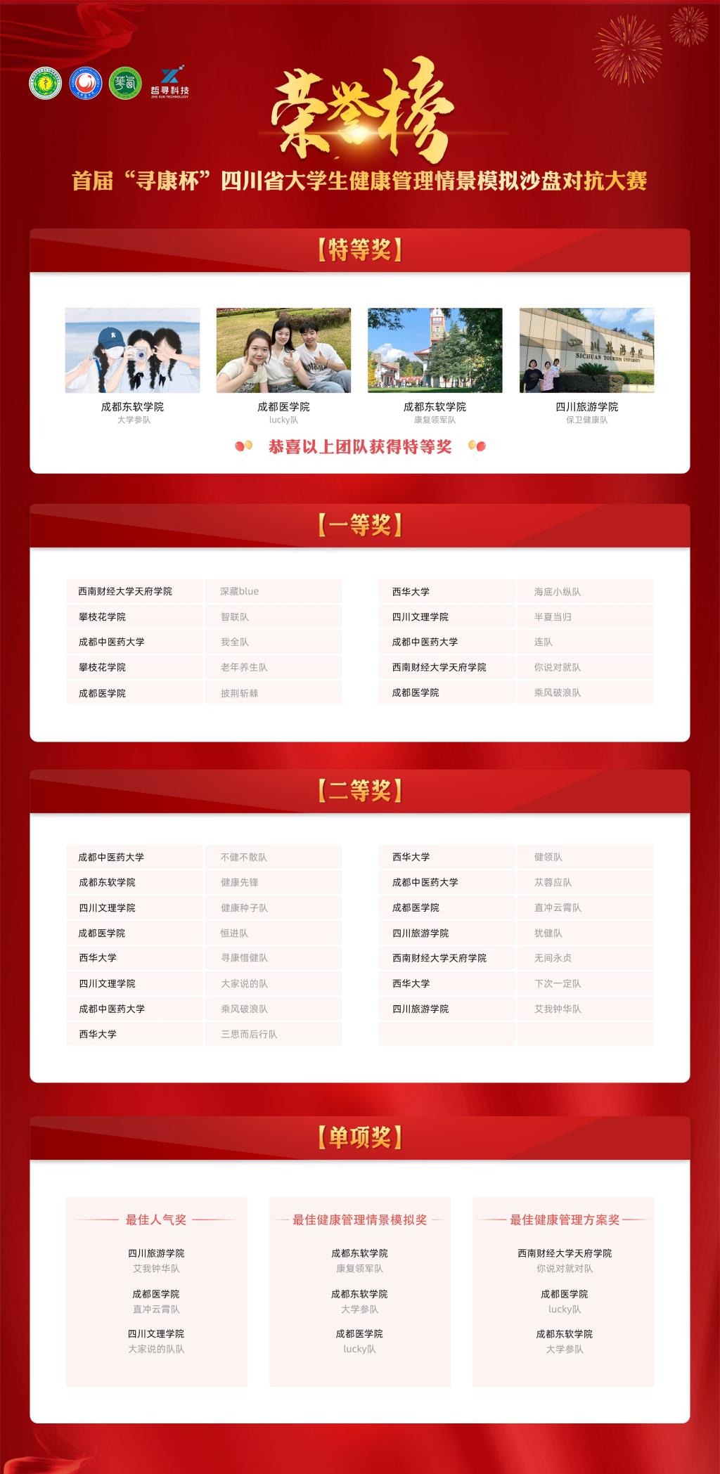 赛事共由三个环节构成,分别是健康管理方案设计、健康管理情景模拟沙盘对抗和现场案例展示,共有来自西华大学、成都中医药大学、攀枝花公司、四川旅游公司、四川文理公司、西南财经大学天府公司、成都东软公司、yl23455永利集团等8所高校的29支队伍、200多名师生参加了大赛。最终决出特等奖4名,一等奖10名,二等奖15名,单项奖9项。公司喜获特等奖一项,一等奖二项,二等奖两项,最佳人气奖、最佳健康管理方案奖、最佳健康管理情景模拟奖各一项。