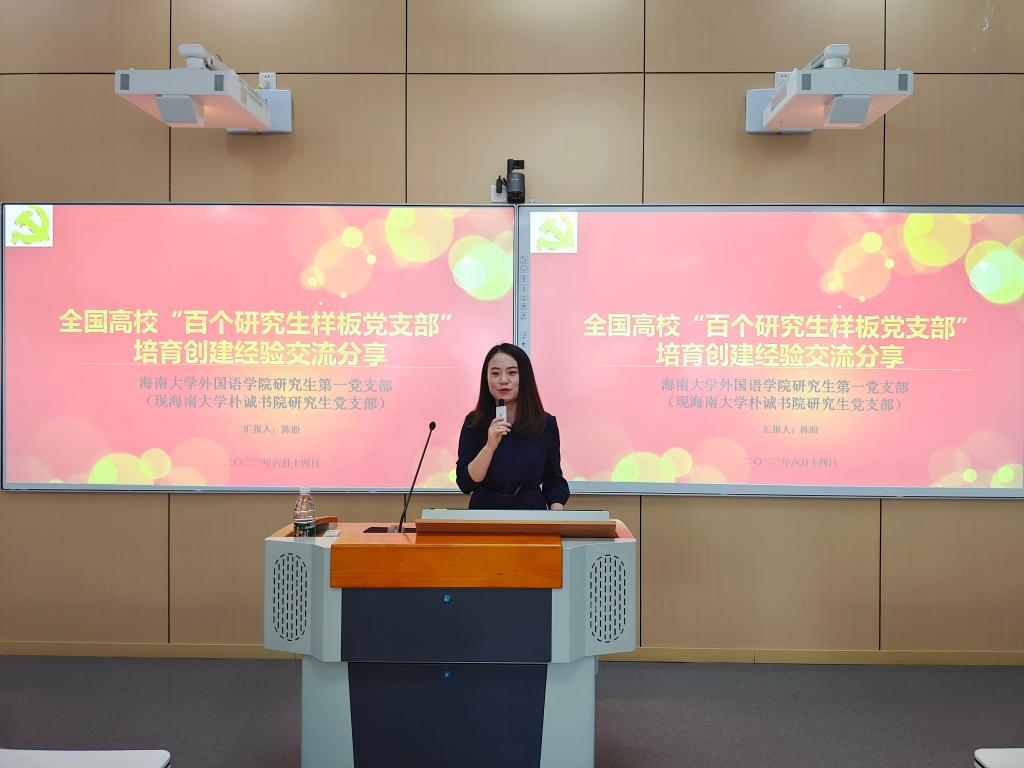 为提高公司基层党支部标准化规范化建设水平,营造积极创建样板支部、培养先锋党员的浓厚氛围,6月14日,在公司党委组织部、员工工作部(处)的指导下,由公司党委主办、红小医辅导员工作室承办的高校样板党支部创建工作研讨会在新都校区教学楼A503举行。公司党委书记彭成静、公司党委组织部组织员王地娟、护理公司党委副书记王润娟、各院系辅导员代表和部分员工党员参加了研讨会。会议由公司党委副书记、红小医辅导员工作室负责人杨晓庆主持。获评教育部首批全国高校“百个研究生样板党支部”的海南大学外国语公司研究生第一党支部(现海南大学朴诚书院研究生党支部,以下简称“研究生党支部”)的支部书记陈盼老师做主题分享。