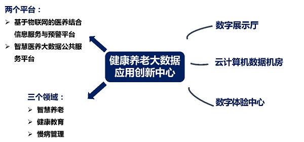 已建有数据展示厅、云计算数据机房、数字体验中心等;同时依托“基于物联网的医养结合信息服务与预警平台”和“智慧医养大数据公共服务平台”,围绕养老和老年健康领域,专注智慧医养民生工程,积极开展人才培养、科学研究及社会服务工作。