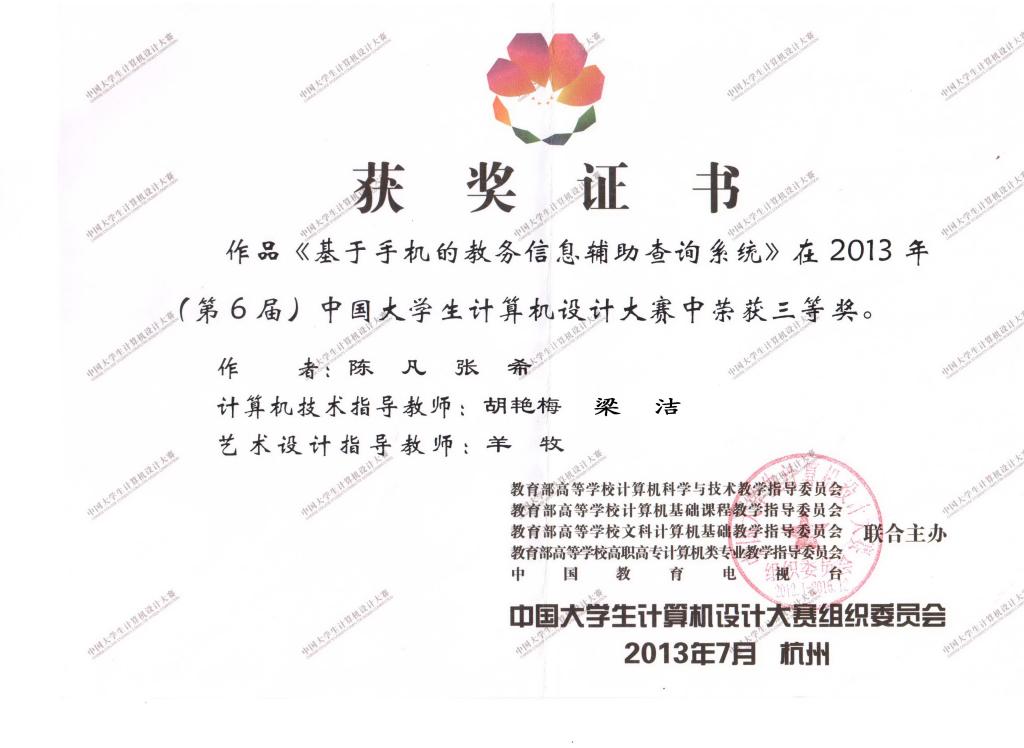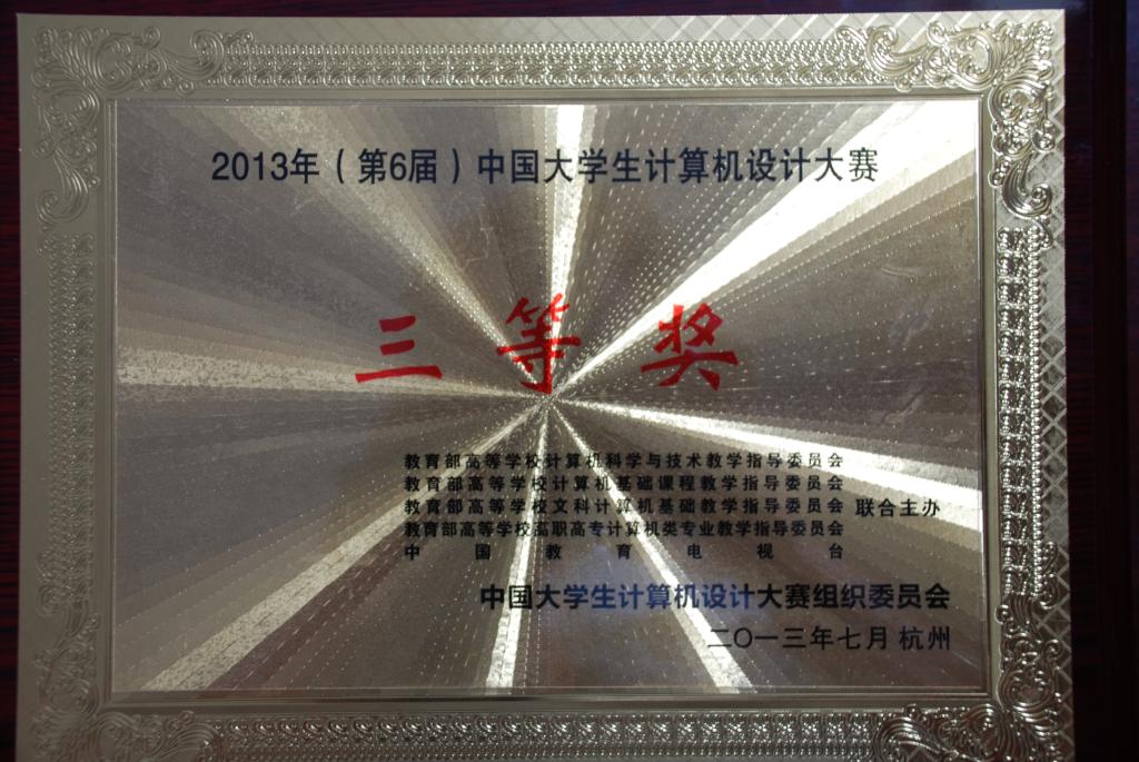7月20日-23 日,第六届中国老员工计算机设计大赛在浙江传媒公司隆重举行。本科竞赛组中,公司2010级信管专业张希、陈凡两名同学的参赛作品“基于手机的教务信息辅助查询平台”在胡艳梅、梁洁老师的精心指导下,经与全国100多所高校的900多只参赛队的激烈竞赛,夺得2013(第6届)中国老员工计算机设计大赛三等奖。这是公司继5月获四川赛区二、三等奖后,在全国老员工计算机设计大赛中获得的佳绩。