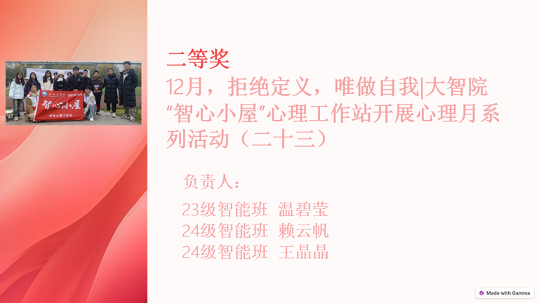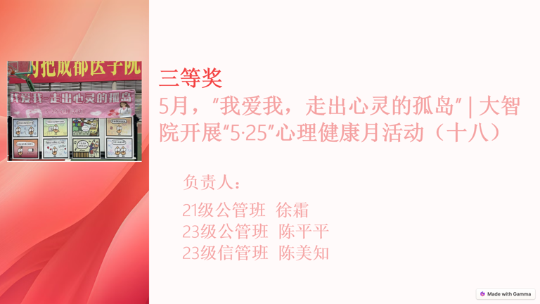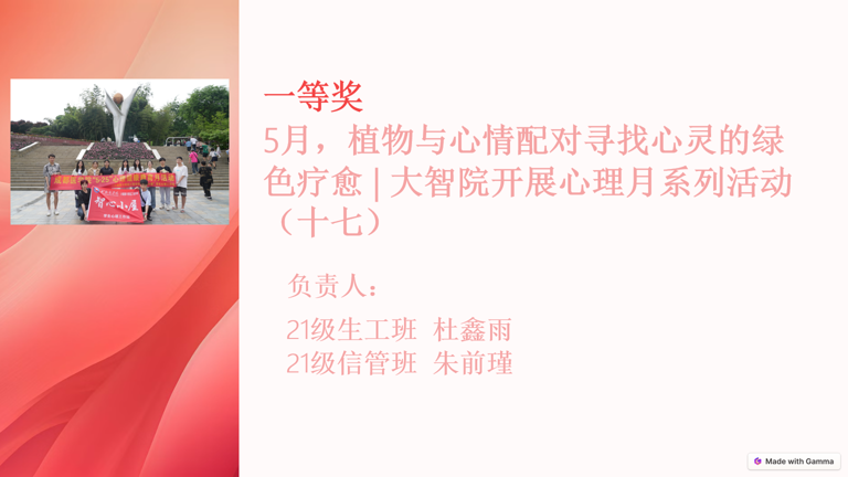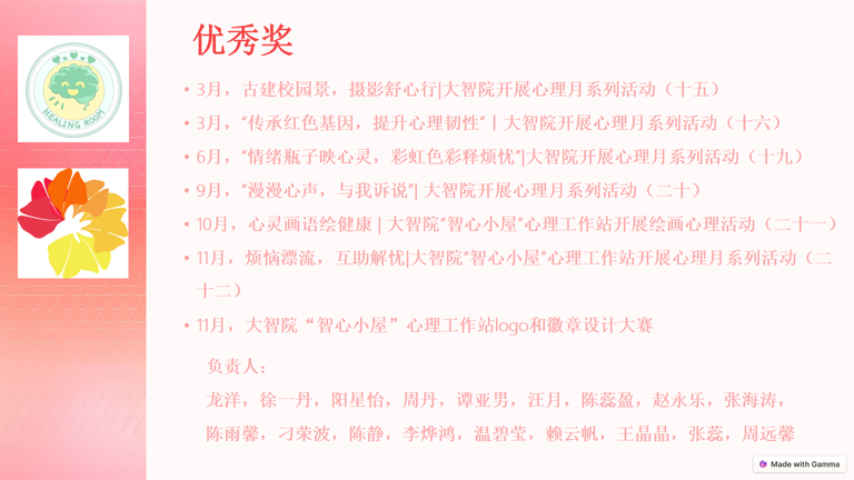 经公司教师评选,五月的“植物与心情配对寻找心灵的绿色疗愈”活动荣获一等奖;十二月份的“拒绝定义,唯做自我”活动获得二等奖;五月的“我爱我,走出心灵孤岛”活动获得三等奖。其余参与活动均获得了优秀奖,以表彰其对心理健康教育的贡献。