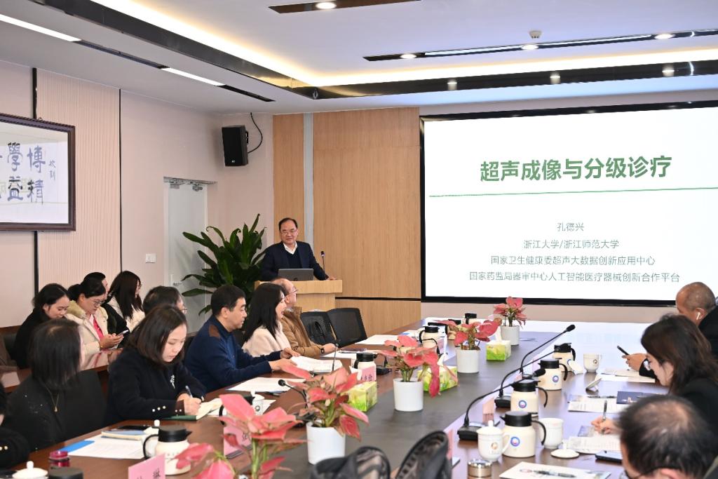孔德兴教授随后开展了《超声人工智能与国家分级诊疗》的精彩讲座。他深入浅出地介绍了超声人工智能技术的前沿进展及其在国家分级诊疗中的重要应用前景,引发了与会人员的热烈讨论。讲座结束后,与会人员围绕讲座内容及相关合作事宜展开了深入的讨论交流,分享了各自的见解与经验,为未来的合作奠定了坚实基础。