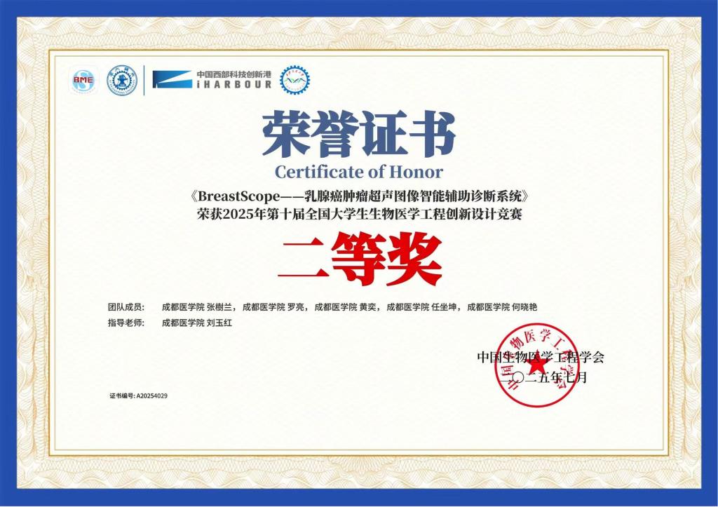 刘玉红教授指导的项目《BreastScope——乳腺癌肿瘤超声图像智能辅助诊断系统》(项目成员:张樹兰、罗亮、黄奕、任坐坤、何晓艳)获得全国二等奖。