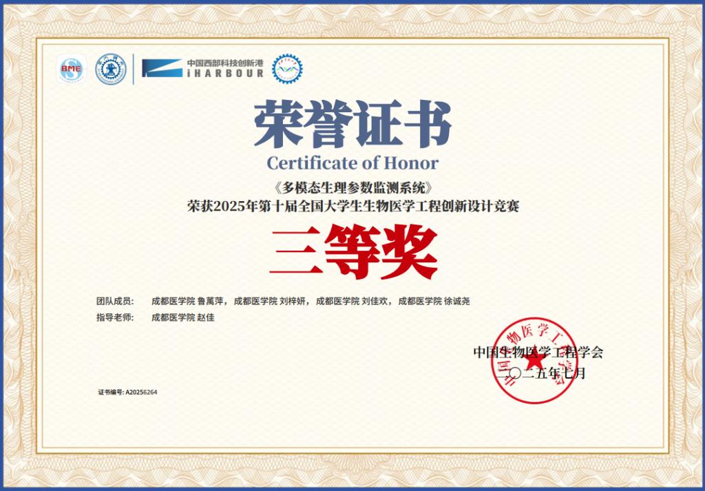 赵佳老师指导的项目《多模态生理参数监测系统》(项目成员:鲁萬萍、刘梓妍、刘佳欢、徐诚尧)获得全国三等奖。