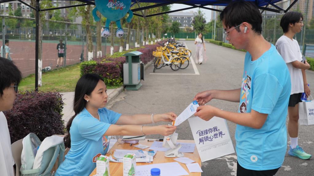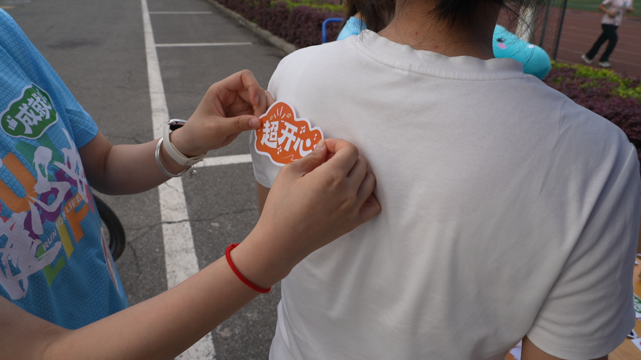 活动伊始,30余名员工身着统一的健心跑T恤,手持联名旗帜,迈着矫健的步伐,沿着操场和校园内的指定路线奔跑起来。在跑步过程中,同学们在每公里打卡处撕除负面情绪贴纸、替换正向情绪贴纸。通过这种简单而富有意义的互动,同学们不仅能够释放压力,还能在运动中感受到积极情绪的传递,增强对自身情绪的管理能力。参与本次活动的李袁彬同学在跑步结束后向活动组织者说道:“跑完五公里感觉身体是疲惫的,但是心情是舒畅的。”