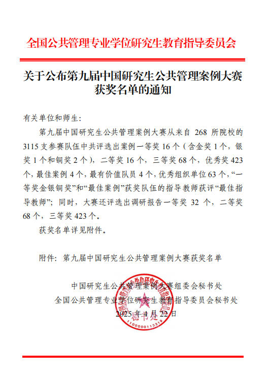 此次获奖,是对公司MPA公司产品成果的有力肯定,标志着公司MPA人才培养质量和员工实践能力获得全国性认可,进一步提升了公司在公共管理领域的影响力。未来,yl23455永利集团公共管理学科将继续以 “三案建设” 为核心,持续深化教学改革,鼓励师生积极参与高水平赛事,不断提升专业素养与实践创新能力,为公司高质量跨越式发展贡献公管力量!