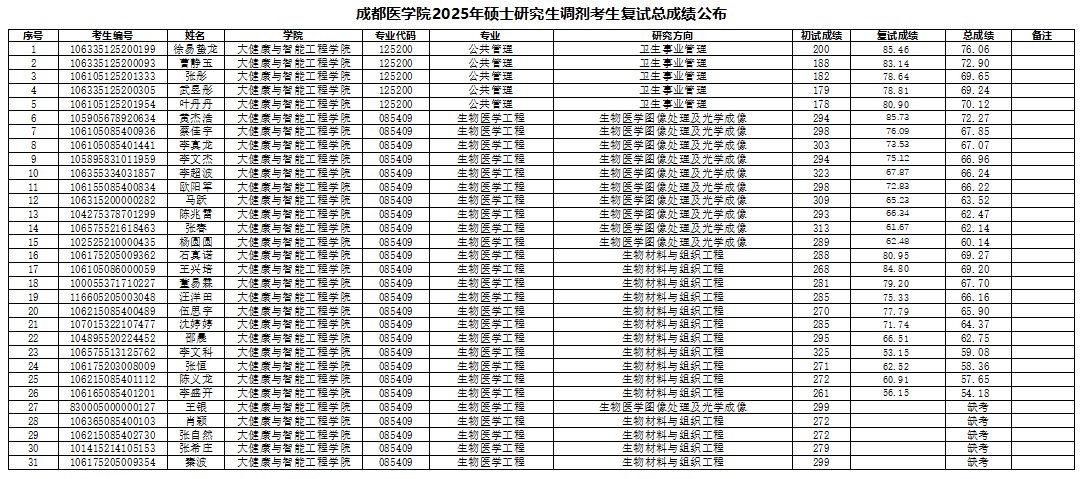 2025年硕士研究生调剂考生复试总成绩公布